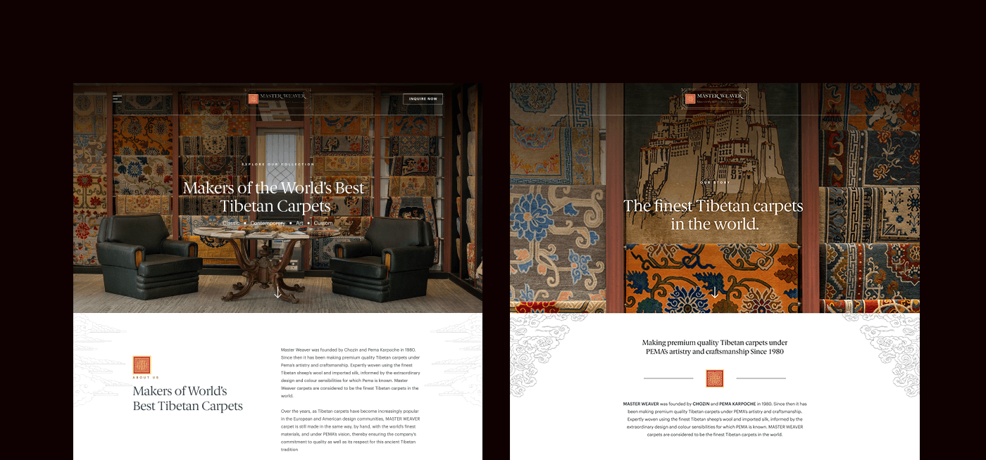 We’re excited to unveil the website we designed for Master Weavers, where the timeless tradition of Tibetan carpets comes to life. Since 1980, this dedicated team has perfected their craft, creating stunning pieces that blend artistic finesse with contemporary elegance. Our design captures the rich legacy and unparalleled craftsmanship behind each rug, showcasing the finest Tibetan sheep wool woven by skilled artisans in Nepal. Explore the new site to discover how Master Weavers transforms ancient techniques into modern masterpieces!